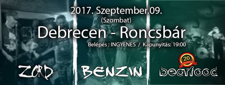 Szeptember 9-én, szombaton ingyenes koncertet ad Zord, a Benzin és a Bearfood a debreceni Roncsbárban. A miskolci, thrash metalban utazó Zord harmadik albuma már a célegyenesben, remélhetőleg még az ősz folyamán a kezükbe is vehetik a műfaj szerelmesei. A jövőre 15 éves Benzin tervei között is szerepel egy új album, de koncert klipekkel és zenés mozival most is folyamatosan ellátják rajongóikat. A két banda zenélt már együtt Miskolcon, és mindkét csapat erősíti az idei Zorall Sörolimpia line-upját is. A stoner metalos Bearfood sem ismeretlen a kelet-magyarországi rockereknek, hiszen a banda idén 20 éves!