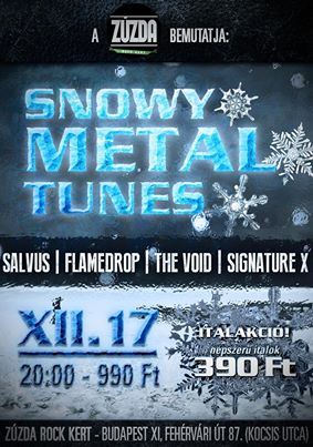 Igazi téli metal móka, szigorúan csak hógolyózás utánra! Közhelyekkel élve beköszöntött a fagyos időszak, lehullottak az első hópelyhek a Zúzda Rock Kertben viszont december közepén is forró a hangulat (túlhevülés ellensúlyozására pénztárcabarát áron elérhetőek az ilyenkor szükséges hűsítő italok is)! A babona szerint szerencsétlenséget hoz a péntek 13, miért ne dacolnánk vele? Ennek örömére az átlagostól több, azaz hat zenekar muzsikál aznap este! Az ország három régiójából (Északnyugat, Dél és a főváros) érkező fellépők közt szerepel az immáron 12 éve aktív dallamos modern metalt képviselő Salvus (Szeged), az idei év során nagylemezzel jelentkezett experimental/indistrial death metal The Void (Szeged), a Rock’n’rollt tolja a Signature X (Kiskunhalas, Kalocsa, Baja), melodic hard rock vonalon a SoulDiver (Szeged), a Zúzda Tehetségkutató győztese, a prog. metal Paradigm Shift (Fertőszentmiklós), valamint a dallamos death metal FlameDrop (Mosonmagyaróvár). A hőmérséklet eshet fagypont alá, a felhozatal gondoskodik arról, hogy a hangulat tetőfokára hágjon!