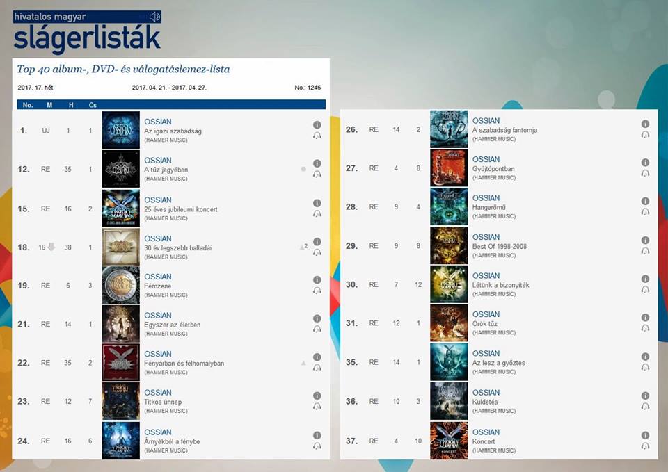 Április 21-én megjelent az Ossian zenekar 22. stúdióalbuma, “Az Igazi Szabadság” címmel, amely már az előrendelések alapján rekord idő alatt, a megjelenés előtt közel egy hónappal elérte az aranylemez státuszt! Így aztán az sem meglepő, hogy egyből a Mahasz-lista 1. helyén nyitott az új Ossian album, Az viszont elképesztően dicséretes adat, hogy az eheti eladási listán összesen 18 (!) Ossian album szerepel. A lemezbemutató koncert ma este lesz a Barba Negra Trackben.