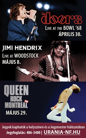 Újra mozivásznon láthatóak a rockzene történetének kiemelkedő zenekarai az Uránia tavaszi koncertfilm-válogatásában. A vetítéssorozat keretében műsorra kerül a The Doors 1968-as „Live at the Hollywood Bowl” koncertfilmje és Jimi Hendrix legendás woodstocki koncertje is. Újdonságként szerepel a programban a Queen 1981-es montreali koncertje, amelyet most láthat először a fővárosi közönség.