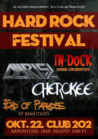 Október 22-én, a Club 202-ben kerül megrendezésre a Hard Rock Fesztivál. Műsorunk első órájában pedig a fesztivál fellépőit látjuk vendégül. A Hard Rock Fesztivált a székesfehérvári End of Paradise zenekar kezdi. A zenekarnak idén tavasszal jelent meg az Ítélet Gyűrűje című EP-je, melyet először mutatnak be a budapesti közönségnek. A kiskunhalasi Ozírisz közel harminc éve alakult. Öt albumuk jelent meg, a tavalyi nagylemezük a Hangsúly szavazásán jelölést kapott az év albuma díjra is, mely már alapból garancia a jó muzsikára. A nemrégiben átalakult IN-Dock zenekar nem tétlenkedett sokáig. A melodikus hard rock muzsikában utazó csapat elkészítette a SorsBár névre keresztelt első lemezét, melyet a Hard Rock Fesztivál keretein belül be is fognak mutatni a nagyérdeműnek. Egy igazi hard rock fesztiválról nem hiányozhat a Cherokee zenekar sem. A csapat nemrégiben találta meg új énekesét Vállai Krisztián személyében. Az énekescsere jót tett a zenekarnak, a Cherokee második nagylemeze gőzerővel készül. Kell is igyekeznie a fiúknak, hiszen a második album a HammerWorld Magazin téli dupla számának extra melléklete lesz.