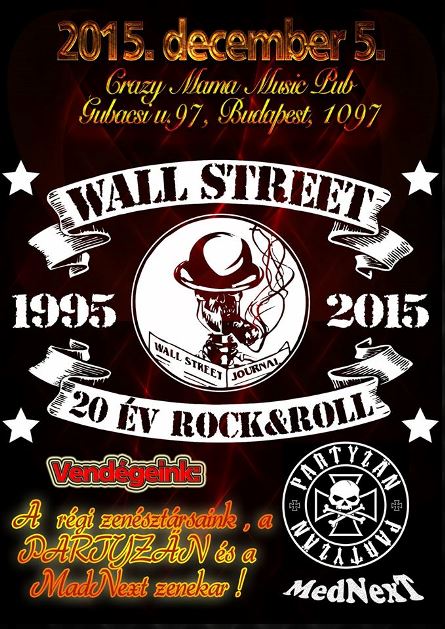 A Wall Street zenekart valószínűleg már nem kell bemutatni a rockzenét kedvelőknek, hiszen – kisebb megszakítással – 1995 óta aktív. Ennek apropójaként december 5-én a Crazy Mamában egy fergeteges koncerttel ünnepli a zenekar a 20. születésnapját. A 20 év Rock&Roll elnevezésű bulin a Wall Street mellett fellép még a MedNexT és a PARTYZÄN is. A koncertre mindenki öltözzön fel szépen, mert a buliról felvétel készül és jövőre nem csak az “Örökké nem eshet” című Wall Street CD ,de a jubileumi buli DVD-je is megjelenik majd. Az elmúlt 20 év emlékezetes eseményei mellett a szülinapi buliról is beszélgetünk majd Mayer Feri gitárossal műsorunk első órájában.