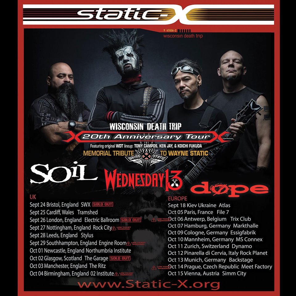 Maga az amerikai turné Memorial Tribute To Wayne Static alcímmel fut, és a DevilDriver játszik rajta társult headlinerként, a koncerteket pedig – pikáns módon – a Dope nyitja majd. Európába ősszel érkeznek majd Wednesday 13, a Soil és szintén a Dope társaságában, a hozzánk legközelebbi koncert Münchenben lesz október 13-án.