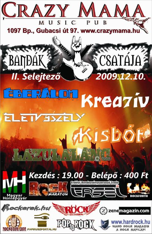Folytatódik a Bandák Csatája, a nagy kihívás! December 10-én, csütörtökön a budapesti Crazy Mama Club-ban a második selejtezővel folytatjuk! Hat banda mérheti össze tudását. Név szerint: Kisbót, Éberálom, Krea7ív, Életveszély, Lazulalánc, a hatodik banda még kiválasztás alatt, de hamarosan kiderül.