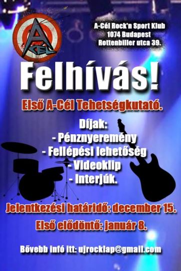 Első alkalommal kerül megrendezésre az A-Cél tehetségkutató. A nemrégiben nyílt budapesti klubban már olyan zenekarok is megmutatták magukat, mint a Tirana Rockers, a Dust N’ Bones, a Sicuband és Kalapács József. Itt az ideje egy jó kis tehetségkutatónak, melynek az első selejtezője január 8-án kerül megrendezésre. A díjak között pénznyeremény, videoklip, fellépési lehetőség, rádióinterjú és video interjú is szerepel. A zsűriben olyan nevek szerepelnek, mint BZ alias Bátky Zoltán, Szávai Gery a Twisterből és Ambrus Zoli (Ex-Irigy Hónaljmirigy, Alcohol), de a teljes listát is hamarosan nyilvánosságra hozzuk.