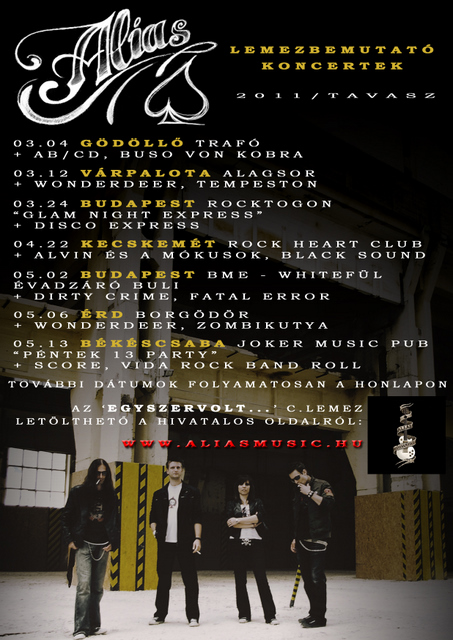 A 2010-ben alakult Alias zenekarral novemberben készült interjúban megtudhattuk, hogy kész az első albumuk, az “Egyszervolt…”, és ma debütált a vadonat új, első videójuk is, melyet az Eltűnik lassan című számra készítettek. A dögös dirty rock zenét játszó banda a lemezét idén meg is turnéztatja, mégpedig az alábbi időpontokban és helyszíneken: