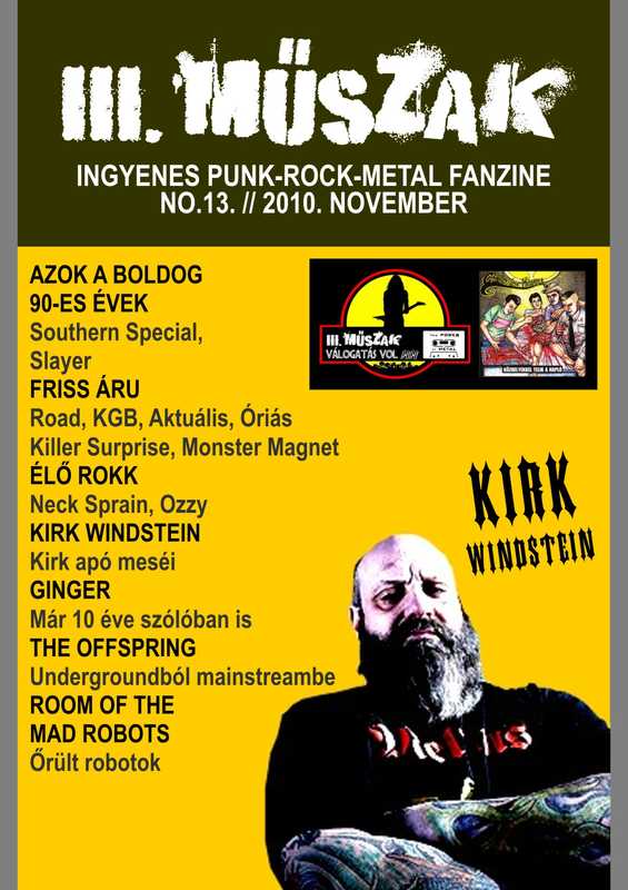 Crowbar, Down, Kingdom Of Sorrow – mi a közös bennük? Igen, mindegyik zenekar könnyed nyári slágereket ír. És még? Igen, csodálatos férfiak alkotják ezen csapatokat. És még? Igen, Kirk Windstein! Na vele olvashattok egy hosszas interjút a novemberi III. Műszakban a Metalsucks jóvoltából! Kirk nemcsak zenekarairól, hanem a rehabról is sztorizik, igazán exkluzív. Ginger (ezúttal The Wildhearts nélkül), az új best of lemezével kapcsolatban osztja meg gondolatait, a Room Of The Mad Robots a tagcseréről és a jövőről mesél, a szerkesztőség pedig végigszalad a The Offspring életművön. Kedvenc rovatunk, az Azok a boldog 90-es évek Southern Special-el és Slayer-el jelentkezik, az Élő rokk Ozzy-val és Neck Sprain-el, a Friss áru pedig Monster Magnet-el, KGB-vel, Aktuálissal, Road-al, Óriással és Killer Surprise-al. Anovemberi kazettamelléklet A oldalán heavy metal zenekarok fejtegetik, hogy Iron Maiden vagy Judas Priest, a B oldalon a 2005-ös hiánypótló Csók és Könny lemez pöffeszkedik, a Közhelyekkel telik a napló. Ez is, az is és az azelőttiek is full ingyen, töltés itt: