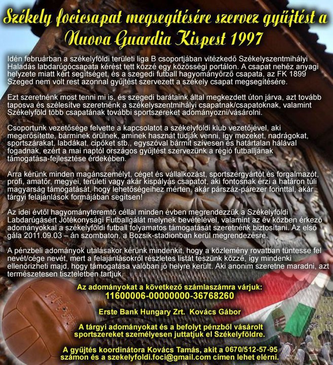 Ahogy a SportSaRock csütörtöki műsorában ígértük, itt látható annak a jótékonysági kezdeményezésnek a plakátja, melynek célja a székelyföldi magyar labdarúgás támogatása. A képre kattintva elolvashatjátok a felhívás mögött rejlő szándékokat és minden tudnivalót megtalál, aki bármilyen formában szeretne hozzájárulni e nemes cél megvalósításához. A segítségeket előre is köszönjük az érintett csapatok, illetve az ügyet felkaroló szegedi és kispesti csoportosulás nevében mindenkinek!