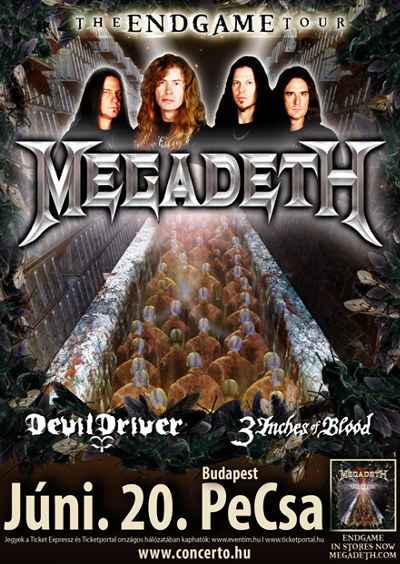 Tisztelt érdeklődők, sok kérdést kaptunk, hogy vajon a június 20-ai Megadeth + DevilDriver + 3 Inches Of Blood koncert a Petőfi Csarnok szabadterén lesz-e megtartva, vagy a teremben. Úgy gondoltuk, egyértelmű, hogy ha nem jelezzük a reklámokban, hogy szabadtér, akkor mindenki tudja, hogy a Pecsa termében lesz a koncert….. Szóval a zuglói csendrendelet 22 órában határozza meg a színpadi aktivitás befejezését, ami egy 3 zenekaros metal orgia esetén kivitelezhetetlen, tekintve hogy 21:00 után sötétedik be. A változékony időjárás miatt sem merült fel bennünk a kültéri buli. Tehát a koncert, az eredeti tervnek megfelelően BENT LESZ és mindenkit csak bátorítani tudunk, jöjjön, nem fog elázni, viszont nagyot zúzhat a kanadai favágókkal, Dez Fafarával és MegaDave-vel! A koncerten egyébként adományokat gyűjtünk a borsodi árvízkárosultaknak, melyhez mindenki hozzájárulhat. A tiszteletjegyesektől is 500 Ft hozzájárulást kérünk. Jegyek még kaphatók az ismert metal boltokban, a Ticket Expressz és Ticketportal országos hálózatában és a helyszínen is. Wake Up Dead! – CONCERTO Music