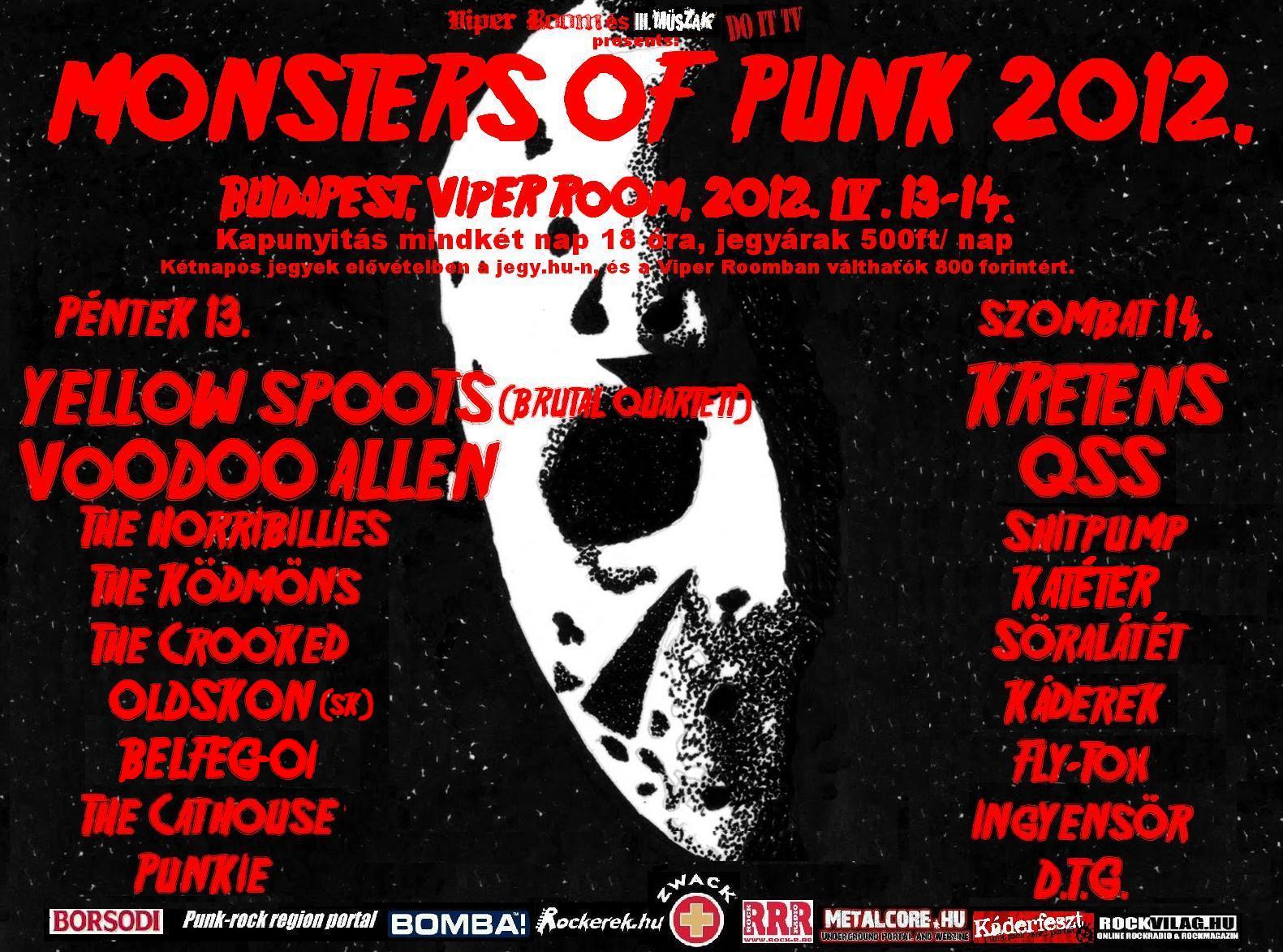 A Monsters of punk 2012 elnevezésű, 18 zenekart felvonultató eseményen a péntek 13-ához híven a hazai rockabilly és psychobilly nevei kapnak főszerepet, mint például a Yellow Spots, a The Ködmöns, Horribillies, Voodoo Allen, The Crooked, és a The Cathouse. Szintén ezen a napon megyünk át egy kicsit a streetpunk világába, méghozzá a rövid szünet után újra színpadra lépő Belfeg-Oi, és a stílust erősítő Pozsonyból érkező Odklon, az estét pedig a fesztivál egyetlen ska képviselője, a Punkie zárja.