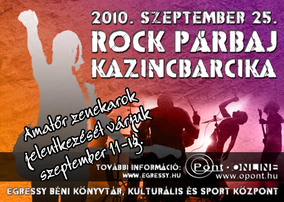 A kazincbarcikai Egressy Béni Könyvtár, Kulturális és Sport Központ újra Rock Párbajt hirdet. A tehetségkutató ideje: 2010. szeptember 25. Helye: Egressy Béni Könyvtár, Kulturális és Sport Központ (3700 Kazincbarcika, Fő tér 5.) Kizárólag az Észak-magyarországi régióbeli, azaz Borsod-Abaúj-Zemplén, Nógrád és Heves megyei zenekarok jelentkezését fogadjuk el. A jelentkezési lap a www.egressy.hu honlap Letöltések menüpontjából érhető el.