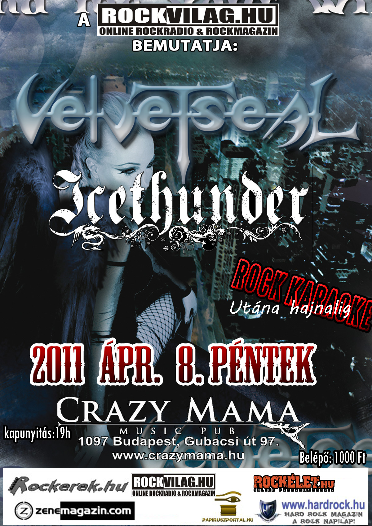 Olyan gyorsan peregnek a napok, hetek, hogy ismét időszerű egy remekbeszabott buli a Rockvilág.hu tagsága számára. A helyszín most is a jól megszokott Crazy Mama Music Pub (IX., Gubacsi út 97.) lesz, a színpadot pedig három zenekar fogja benépesíteni: elsőként a marosvásárhelyi Backlash lép a színünk elé, majd az Icethunder játszik nekünk, végül pedig a gothic metal jeles hazai képviselője, a Velvet Seal kápráztatja majd el a jelenlévőket. A három koncert után tiétek a színpad és a mikrofon, hiszen szédületes karaoke zárja az estét, aminek majd valamikor majdnem reggel lesz csak vége 🙂