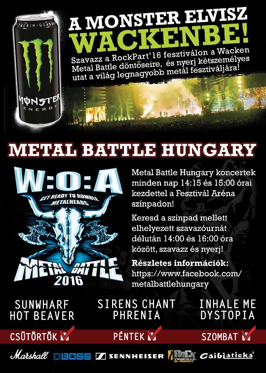 A 2016-os verseny külön érdekessége, hogy nem csak a hazai döntő győztese jut ki Wackenbe, hogy augusztus elején Magyarországot képviselve összemérje erejét 29 másik ország nyertesével a nemzetközi fődíjért, de a közönségből is utazhat valaki. A Monster energiaital ugyanis kétszemélyes utat sorsol ki azok között, akik a RockParton a Fesztivál Aréna színpadnál bármelyik nap 14-16 óra között leadják szavazatukat a nekik legjobban tetsző zenekarra. A közönség és a zsűri szavazatai 50-50%-ban befolyásolják azt, hogy ki lesz a magyarországi győztes, így már ezért is érdemes szavazni, a kétszemélyes wackeni utazás és fesztiválbérlet pedig csak hab a tortán.