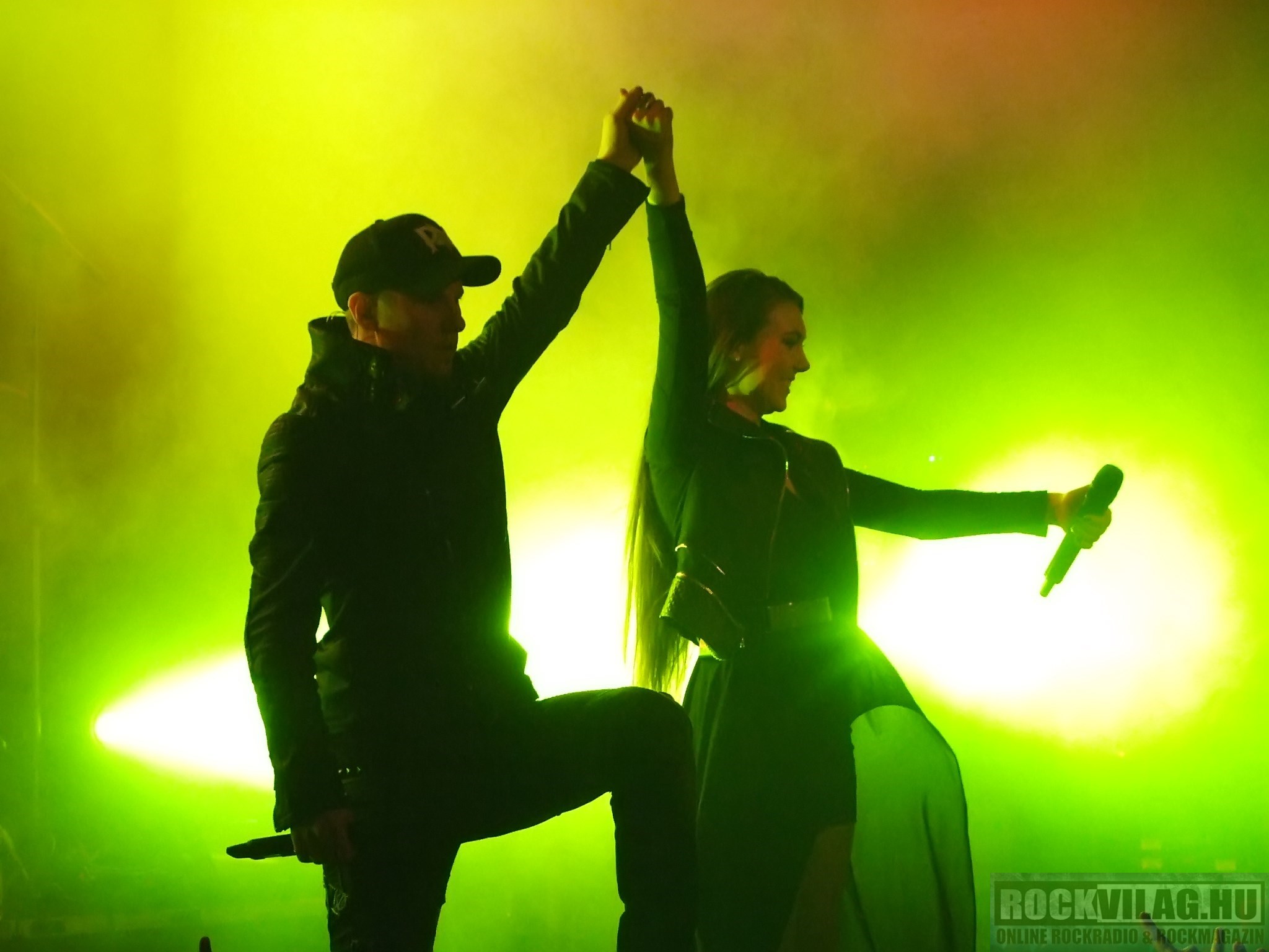 Este kilenc után húsz perccel, aztán színpadra lépett az Amaranthe csapata. A három énekessel rendelkező brigádot hatalmas lelkesedéssel fogadta, az időközben felgyülemlett közönség. Jó volt ez, de maradandó nyomokat nem hagyott bennem a koncert. Ugyan a hangulat pompás volt, a közönség és a banda folyamatosan kapcsolatban volt egymással. A zenészek lepacsiztak az elsősorral, és minden egyes tapsért, hálásak voltak. Így kell ezt, nyilvánvalóan, de zeneileg valahogy még is foghíjas volt az este. Hogy miért? Szerintem az Amaranthe, habár kiváló zenekar, de még nem érett meg egy koncert főzenekari szerepére. A hetven perces set-jüket nem tuják még úgy kitölteni, hogy az egy minden igényt kielégítő show legyen. Ehhez még évek, és albumok kellenek. Ugyan amit egyénileg csinálnak a színpadon, akár Elize énekesnő, akár Jake vagy Andy énekesek, vagy akár a szőke-elf gitáros Olof az hibátlan, de összességében még van mit beletenni náluk egy-egy buliba. Szerintem tudja ezt a zenekar is, hogy nincs még annyi tökéletes, és ismert daluk, hogy elvigyenek egy teljes koncertet, ezért, az amúgy nem hosszú buli idejéből még Johan, a basszusgitáros egyszemélyes beszédblokkjával is csíptek le időt. Na ez az amit egy profi zenekar nem engedhet meg magának. Lehet számok közben kommunikálni, az énekesnek (énekeseknek), de hogy a basszusgitáros 5 percet beszéljen, közhelyekkel teletűzdelve arról, hogy, jaj de hálásak a közönségnek, az nem fér bele. Az, hogy ezt még azzal is megtoldották, hogy Jake egy kis időre átvette a basszusgitárt Johan kezéből, és bohóckodott vele a színpadon egy sort, már végképp nem fér bele egy ilyen időtartalmú show kereteibe. Összességében a hangulat jó volt, a „nagy” Amaranthe slágereket jó volt hallani, de az ilyen időhúzás jellegű közjátékok, nagyon nyomot hagytak az összképben. Jó volt, jó volt, de lesz ez még sokkal jobb is remélem…